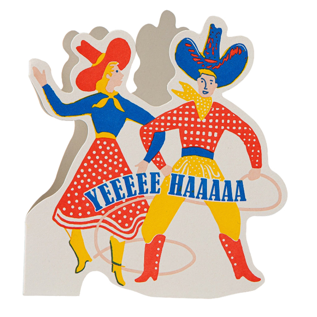 A colourful cut out card featuring a cowboy couple in blue, yellow and red...yee haa!