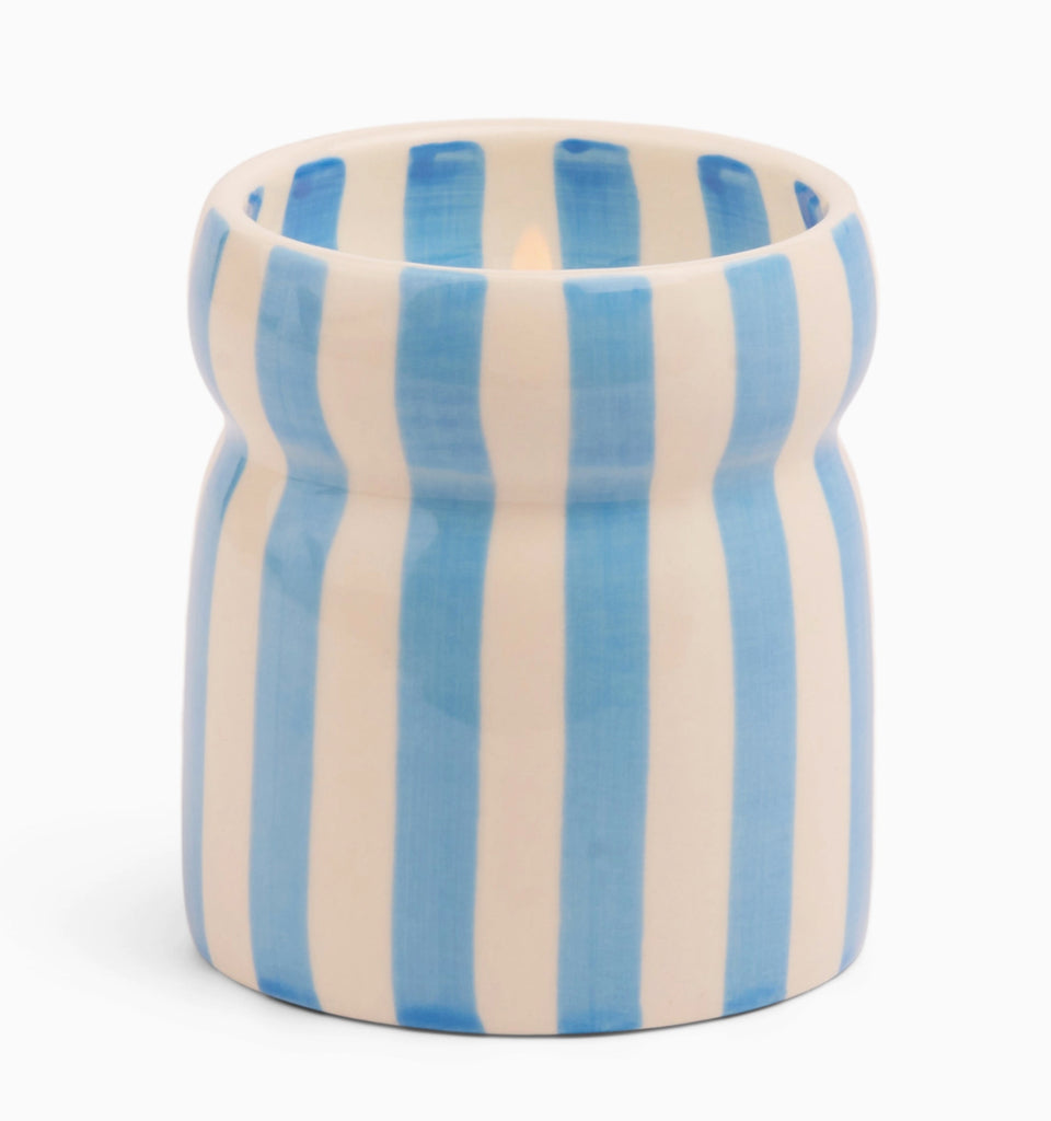 This hand painted candle is inspired by striped umbrellas. After the candle has burned the food-safe ceramic vessel can be reused.