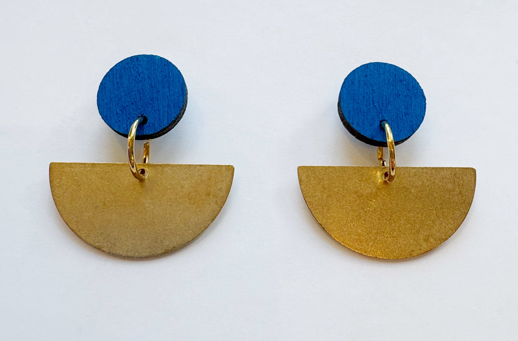 Hand painted plywood in blue with brass semi circle dangling shape.