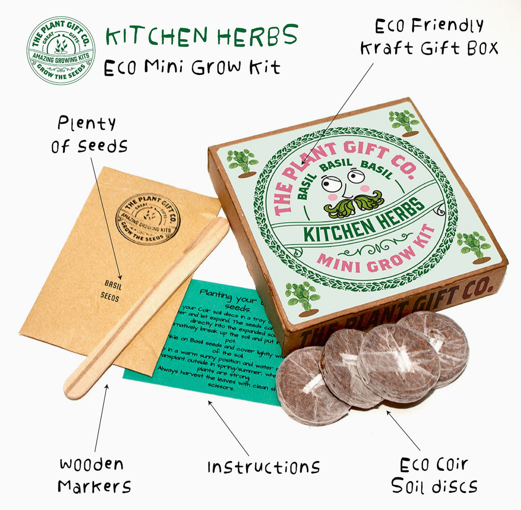 What’s in the Kit? - 1 Packet of easy-grow herb Basil - Step-By-Step beginners sowing guide - wooden plant markers - Eco coir soil disc