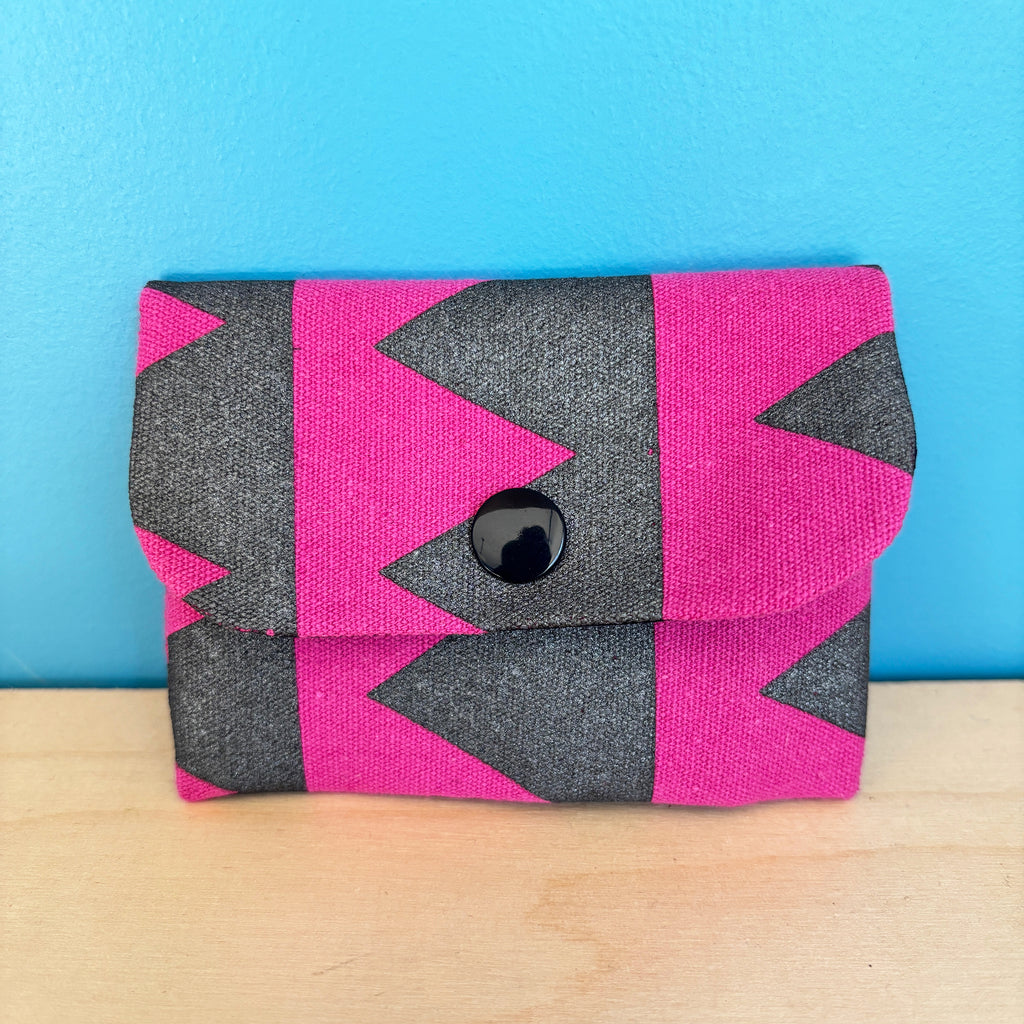 Hand screen printed card wallet. Slightly sparkly black triangle pattern on cerise fabric on the outside with a navy blue lining. Split into three sections, with enough room for your cards and a couple of notes or coins, with a navy coloured popper to secure it shut.