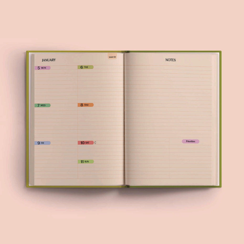 A5 hardback diary for 2026 – week-to-view layout on the left, full lined notes page on the right.